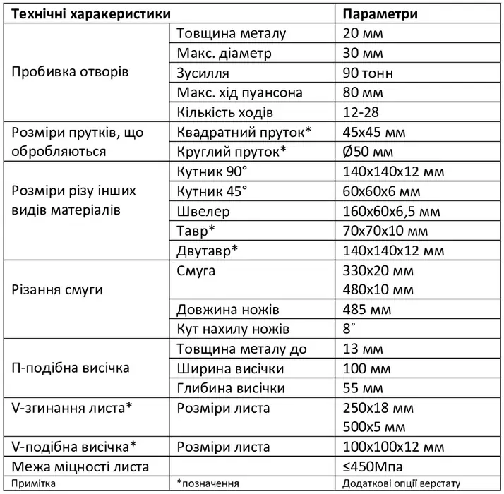 - 5 робочих станцій - пробивання отворів, рубка кутника, рубка швелера, гільйотинні ножиці та висікання